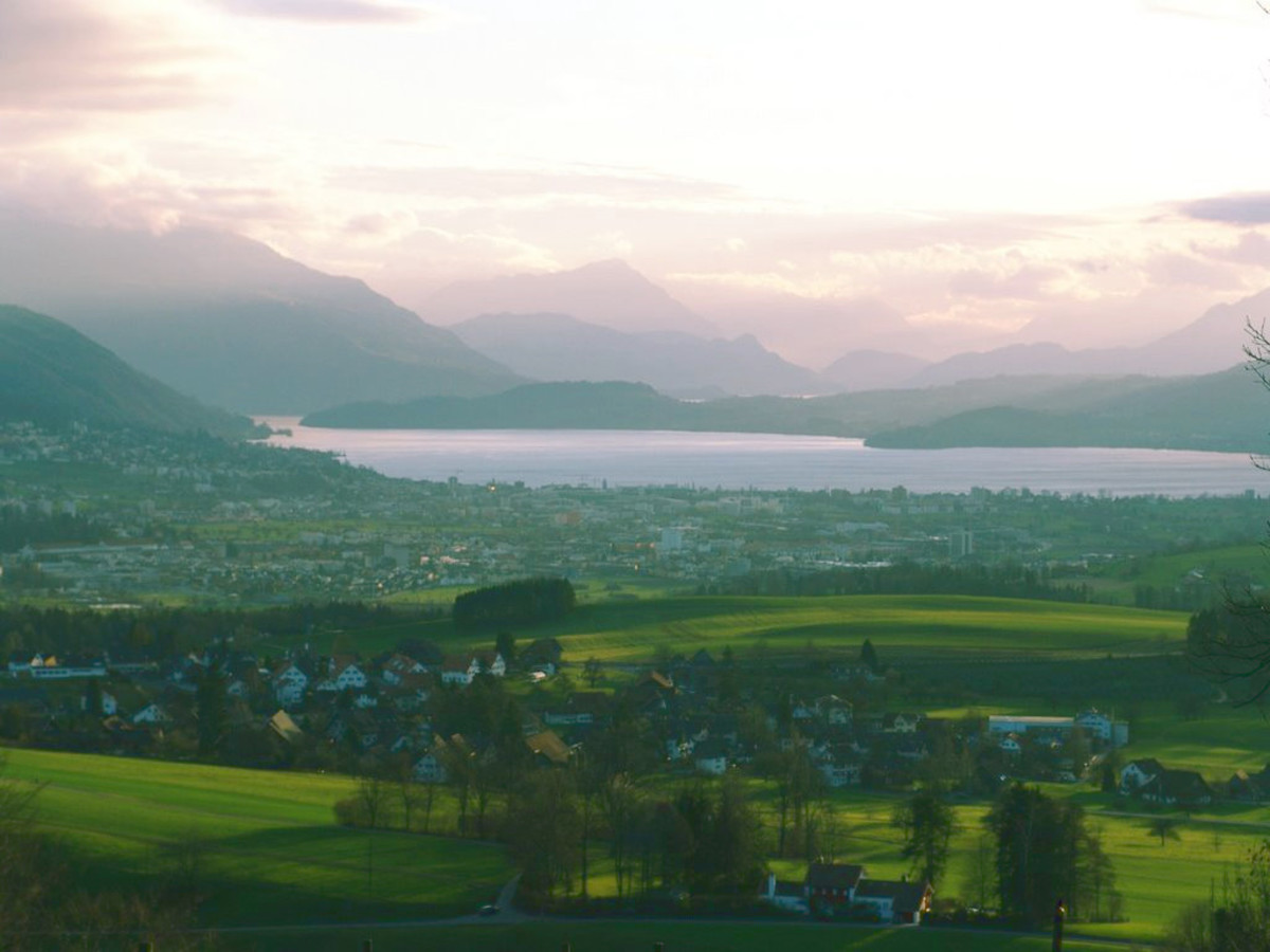 A view south over the Zug, Baar and the Glarner Alps in the background. The Rigi stands on the left and the Pilatusberg on the right.