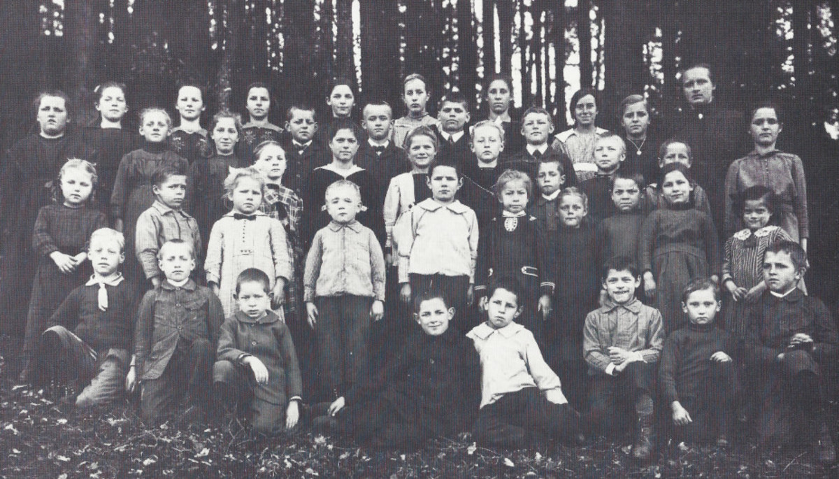 Teacher Hanna Graf with her students at the Spitzen in 1920. Some of the Graf (Groff) family joined the Anabaptist movement and the name is well represented at the Groffdale Mennonite Conference in Pennsylvania today. Virtually all of the children on this picture would have relatives in Pennsylvania.
